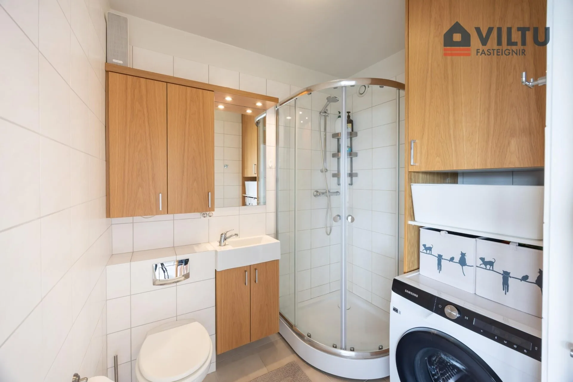 Baðherbergið: Flísalagt í hólf og gólf, með sturtu, upphengdu salerni og snyrtilegri innréttingu. Tengi er fyrir þvottavél inni á baði sem þykir mikill kostur.