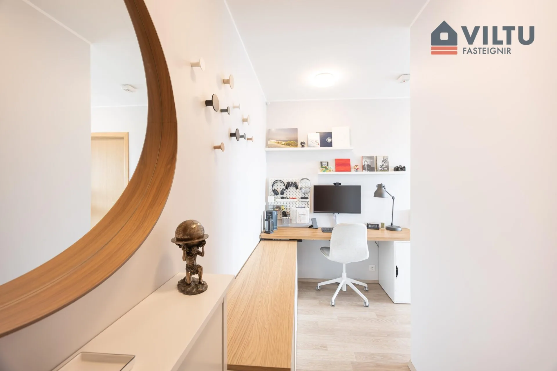 Vinnuaðstaða: Á gangi, sem tengir saman rýmin, hefur verið útbúin glæsileg vinnuaðstaða. Þar er sérsmíðað borð og hillur, ásamt hvítum skápum sem nýta plássið fullkomlega. Þetta rými hentar sérstaklega vel fyrir heimaskrifstofu.